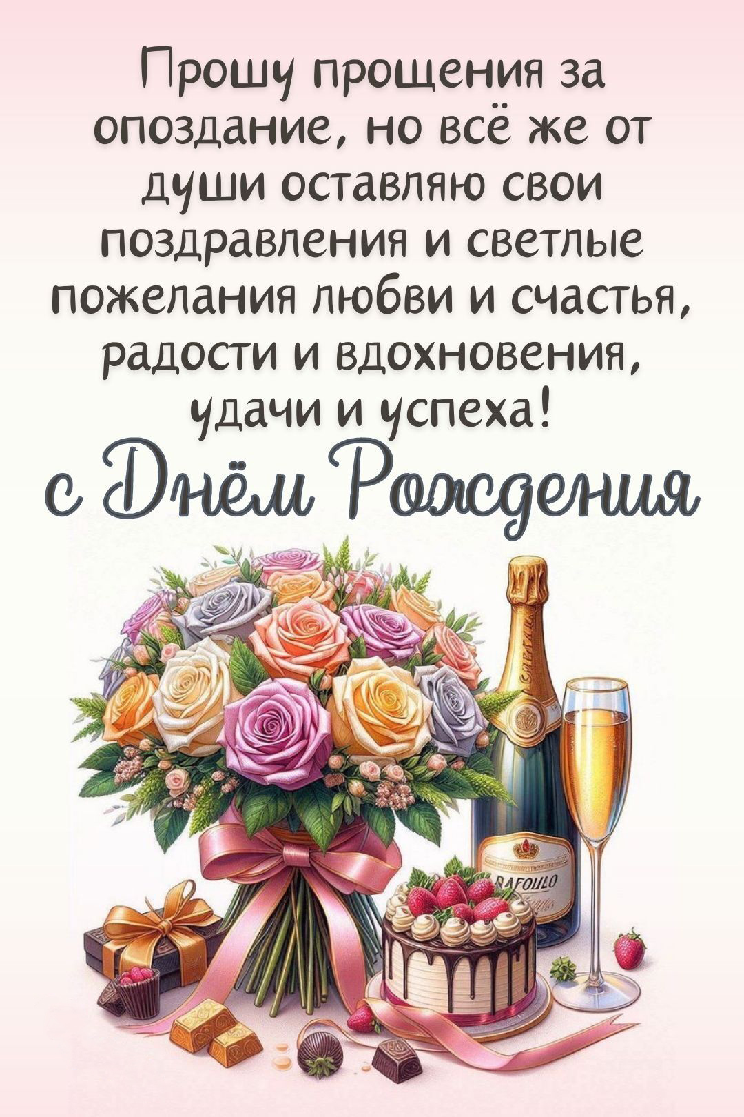 Открытка с прошедшим днем рождения. С опозданием. Розы.