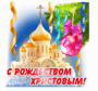 Открытка с Рождеством Христовым gif анимационная. Храм и еловая веточка с елочным шариком.