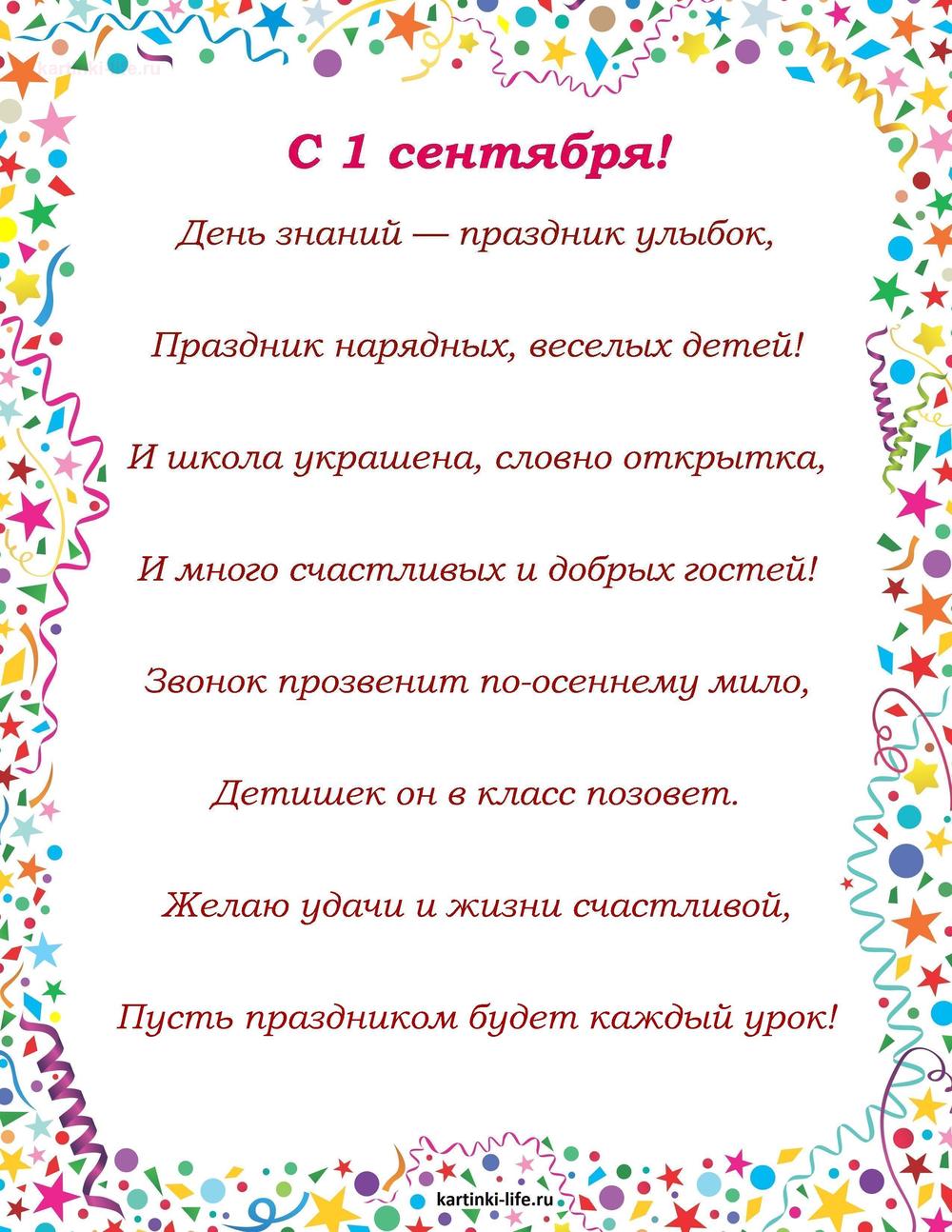 ← Предыдущая ГОЛОСОВЫЕСледующая → С 1 Сентября. Красивые открытки и картинки пока 0оставить комментарий РЕКОМЕНДОВАНО К ПРОСМОТРУ Открытка, картинка, 1 сентября, начало учебного года, день знаний, школа, поздравление, праздник, книга. Открытки Открытка, картинка, 1 сентября, начало учебного года, день знаний, школа, поздравление, праздник, книга, школьники.ОТКРЫТЬСКАЧАТЬ Анимированная открытка С 1 сентября последний звонокОТКРЫТЬСКАЧАТЬ Открытка, картинка, 1 сентября, начало учебного года, день знаний, школа, поздравление. Открытки Открытка, картинка, 1 сентября, начало учебного года, день знаний, школа, поздравление, пожелание.ОТКРЫТЬСКАЧАТЬ Открытка До свиданья, лето! Школа, здравствуй!ОТКРЫТЬСКАЧАТЬ Песня на 1 сентября – Будет первый звонок. [1 сентября, начало учебного года, День знаний - Музыкальные поздравления]ОТКРЫТЬСКАЧАТЬ С Днем знаний! Легких контрольных, интересных уроков, веселых дней и верных друзей! Открытка с Днем знаний, 1 сентября, ученики, мальчик с букетом цветов, девочка звонит в колокольчик, осенние листья, воздушные шары.ОТКРЫТЬСКАЧАТЬ Открытка, картинка, 1 сентября, начало учебного года, день знаний, поздравление, первый звонок, осень. Открытки Открытка, картинка, 1 сентября, начало учебного года, день знаний, поздравление, первый звонок, осень, колокольчики.ОТКРЫТЬСКАЧАТЬ Открытка, картинка, 1 сентября, начало учебного года, день знаний, поздравление, первый звонок, листва. Открытки Открытка, картинка, 1 сентября, начало учебного года, день знаний, поздравление, первый звонок, листва, сентябрь.ОТКРЫТЬСКАЧАТЬ 1 сентября. Открытка с пожеланием от совы-учителя. С Днем знаний! Я желаю тебе крепких знаний в этом новом учебном году. Исполнения заветных желаний, пусть удача и счастье придут.ОТКРЫТЬСКАЧАТЬ 1 сентября. Пожелание на День знаний для первоклассника. Когда сентябрь наступает, звенит торжественный звонок! И всех ребят он приглашает на увлекательный урок! Тебя мы в этот праздник знаний хотим поздравить от души, желаем новых начинаний, успехов и побед больших!ОТКРЫТЬСКАЧАТЬ 299 открытокС 1 СЕНТЯБРЯ С ДНЕМ ЗНАНИЙ ПОЖЕЛАНИЯ Открытки с Днем рождения Продолжить просмотр Поздравление на первое сентября, на день знаний. День знаний — праздник улыбок, Праздник нарядных, веселых детей!