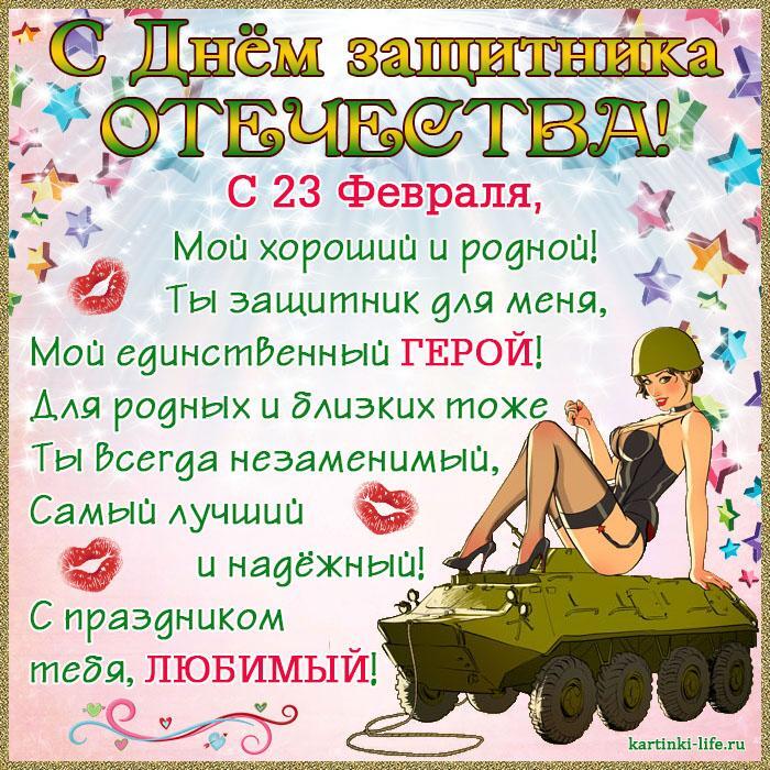 Поздравление с 23 Февраля для любимого: С 23 Февраля, Мой хороший и родной! Ты защитник для меня, Мой единственный герой! Для родных и близких тоже Ты всегда незаменимый, Самый лучший и надежный! С праздником тебя, любимый!