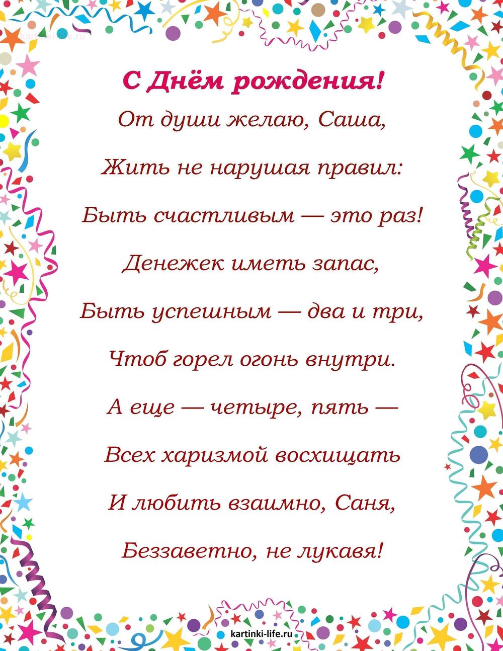← Предыдущая ГОЛОСОВЫЕСледующая → Выберите и нажмите! Другие варианты открыток с этим текстом Скачать Скачать Скачать Скачать Скачать Скачать Скачать Скачать Скачать Скачать Скачать Скачать Скачать Скачать Скачать СкачатьАлександр. Открытки С Днем рождения по именам. Поздравления. пока 0оставить комментарий РЕКОМЕНДОВАНО К ПРОСМОТРУ С Днем рождения, Александр! Happy birthday, Alexander!. [Поздравления Александру с днем рождения, мужчине]ОТКРЫТЬСКАЧАТЬ Именные открытки Александру с Днем рождения, мужчине. Сладости, подарки, котик.ОТКРЫТЬСКАЧАТЬ С Днем Рождения Александр - Поздравления - Пожелания. [Поздравления Александру с днем рождения, мужчине]ОТКРЫТЬСКАЧАТЬ Именные открытки Александру с Днем рождения, мужчине. Собачка, пожелание в стихах.ОТКРЫТЬСКАЧАТЬ С Днем Рождения Александр! Поздравления С Днем Рождения Александру. С Днем Рождения Александр Стихи. [Поздравления Александру с днем рождения, мужчине]ОТКРЫТЬСКАЧАТЬ Именные открытки Александру с Днем рождения, мужчине. Пожелание, цветы.ОТКРЫТЬСКАЧАТЬ Именные открытки Александру с Днем рождения, мужчине. Пожелание, море, пальмы.ОТКРЫТЬСКАЧАТЬ Именные открытки Александру с Днем рождения, мужчине. Пожелание, цветы, конфеты.ОТКРЫТЬСКАЧАТЬ Авторская открытка с днем рождения для АлександраОТКРЫТЬСКАЧАТЬ Поздравляю С днем рождения, Саша. [Александр, с днем рождения, мужчине]ОТКРЫТЬСКАЧАТЬ Открытки С Днем рождения по именам Открытки С Днем рождения по категориям Продолжить просмотр Поздравление с Днем рождения Александру в стихах мужчине. От души желаю, Саша, Жить не нарушая правил: Быть счастливым —