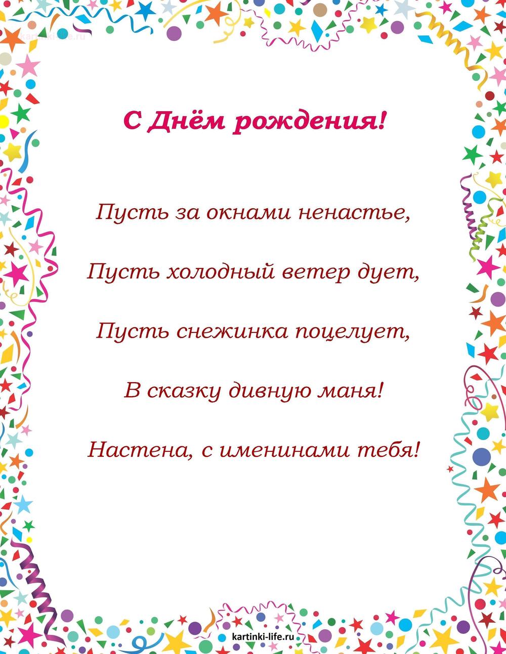 ← Предыдущая ГОЛОСОВЫЕСледующая → Выберите и нажмите! Другие варианты открыток с этим текстом Скачать Скачать Скачать Скачать Скачать Скачать Скачать Скачать Скачать Скачать Скачать Скачать Скачать Скачать Скачать СкачатьАнастасия. Открытки С Днем рождения по именам. Поздравления. пока 0оставить комментарий РЕКОМЕНДОВАНО К ПРОСМОТРУ Именные открытки с Днем рождения Анастасия. Поздравление с приколом с Днем рождения скачать на мобильный.ОТКРЫТЬСКАЧАТЬ Именная картинка с днем рождения НастяОТКРЫТЬСКАЧАТЬ Поздравление и красивые розы Насте на День РожденияОТКРЫТЬСКАЧАТЬ Трогательное поздравление. С днем рождения, Анастасия!. [Поздравления Анастасия Настя Настенька Настюша Настасья с днем рождения]ОТКРЫТЬСКАЧАТЬ Прикольная анимация с днем рождения Анастасия!ОТКРЫТЬСКАЧАТЬ С днем рождения, Анастасия! Счастья тебе, родная!. [Поздравления Анастасия Настя Настенька Настюша Настасья с днем рождения]ОТКРЫТЬСКАЧАТЬ Яркое поздравление. С Днем рождения, Настя!. [Поздравления Анастасия Настя Настенька Настюша Настасья с днем рождения]ОТКРЫТЬСКАЧАТЬ Картинка Настюша с днем рождения со стихамиОТКРЫТЬСКАЧАТЬ Красивая анимированная открытка с днем рождения Анастасия!ОТКРЫТЬСКАЧАТЬ Гиф с днем рождения Настя!ОТКРЫТЬСКАЧАТЬ Открытки С Днем рождения по именам Открытки С Днем рождения по категориям Продолжить просмотр Поздравление с Днем рождения Анастасии в стихах. Пусть за окнами ненастье, Пусть холодный ветер дует, Пусть снежинка поцелует,