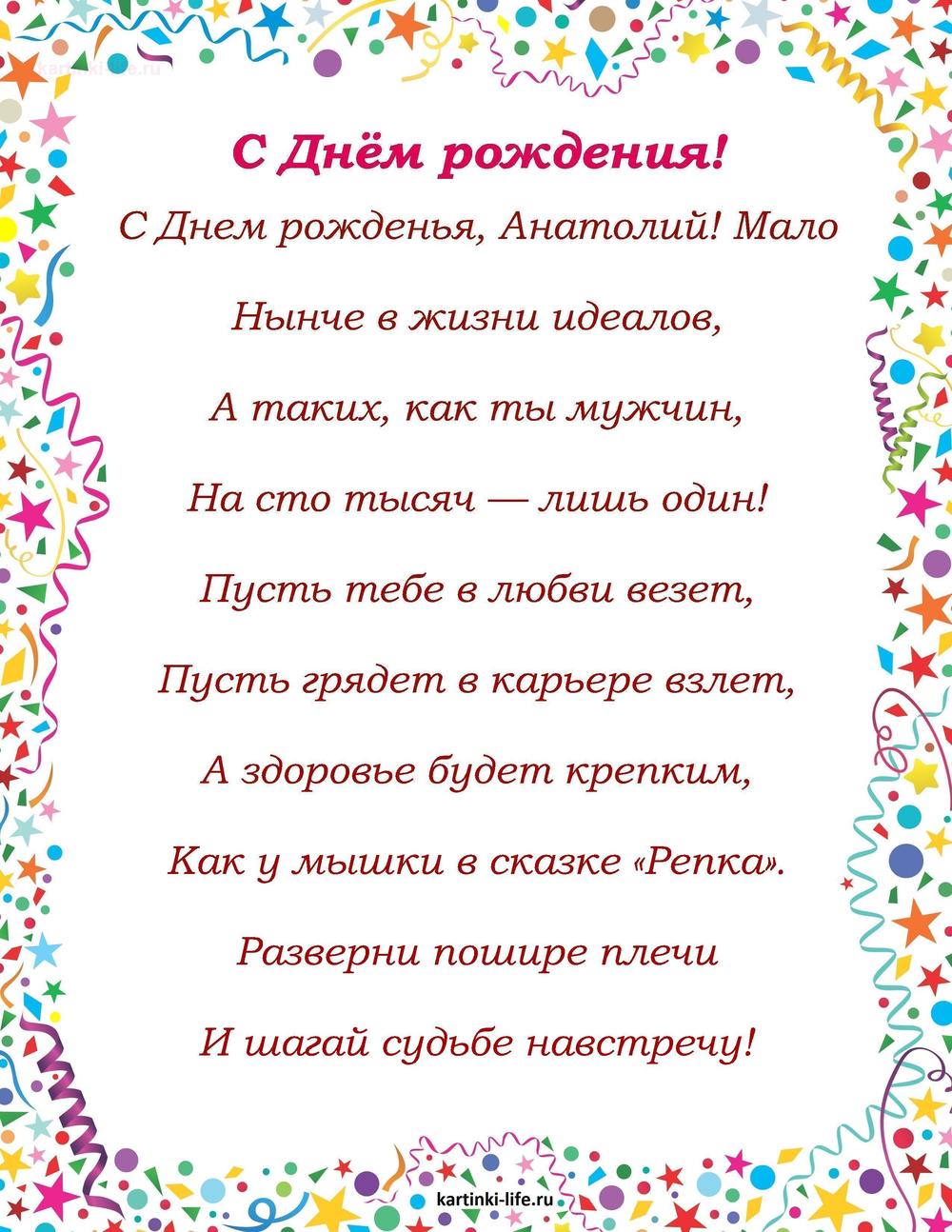 ← Предыдущая ГОЛОСОВЫЕСледующая → Выберите и нажмите! Другие варианты открыток с этим текстом Скачать Скачать Скачать Скачать Скачать Скачать Скачать Скачать Скачать Скачать Скачать Скачать Скачать Скачать Скачать СкачатьАнатолий. Открытки С Днем рождения по именам. Поздравления. пока 0оставить комментарий РЕКОМЕНДОВАНО К ПРОСМОТРУ Прикольная картинка Толя с днем рожденияОТКРЫТЬСКАЧАТЬ Картинка со стихами для Анатолия!ОТКРЫТЬСКАЧАТЬ Именные открытки с Днем рождения Анатолий. Душевное поздравление на смартфон с Днем рождения скачать.ОТКРЫТЬСКАЧАТЬ Анатолий, с днем рождения! Открытка со стихами другу.. [Поздравления Анатолий Толя Толик Толян с днем рождения]ОТКРЫТЬСКАЧАТЬ Поздравление для Анатолия от Путина. [Поздравления Анатолий Толя Толик Толян с днем рождения]ОТКРЫТЬСКАЧАТЬ Красивая анимация на день рождения для Анатолия!ОТКРЫТЬСКАЧАТЬ Яркое поздравление. С Днем рождения,Анатолий!. [Поздравления Анатолий Толя Толик Толян с днем рождения]ОТКРЫТЬСКАЧАТЬ Открытка с днем рождения дядя ТоляОТКРЫТЬСКАЧАТЬ Музыкальная открытка Анатолию с днем рождения.. [Поздравления Анатолий Толя Толик Толян с днем рождения]ОТКРЫТЬСКАЧАТЬ Именные открытки с Днем рождения Анатолий. Поздравление с Днем рождения.ОТКРЫТЬСКАЧАТЬ Открытки С Днем рождения по именам Открытки С Днем рождения по категориям Продолжить просмотр Поздравление с Днем рождения Анатолию в стихах. С Днем рожденья, Анатолий! Мало Нынче в жизни идеалов, А таких, как ты мужчин,