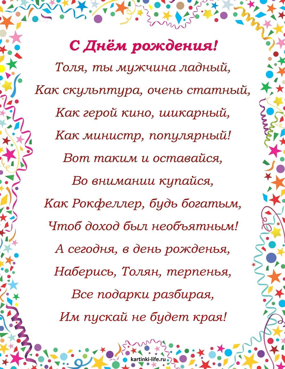 ← Предыдущая ГОЛОСОВЫЕСледующая → Выберите и нажмите! Другие варианты открыток с этим текстом Скачать Скачать Скачать Скачать Скачать Скачать Скачать Скачать Скачать Скачать Скачать Скачать Скачать Скачать Скачать СкачатьАнатолий. Открытки С Днем рождения по именам. Поздравления. пока 0оставить комментарий РЕКОМЕНДОВАНО К ПРОСМОТРУ Толик, с днем рождения! I love you.... [Поздравления Анатолий Толя Толик Толян с днем рождения]ОТКРЫТЬСКАЧАТЬ С Днем Рождения, Анатолий! Яркое и трогательное поздравление для мужа брата сына папы. [Поздравления Анатолий Толя Толик Толян с днем рождения]ОТКРЫТЬСКАЧАТЬ Именные открытки с Днем рождения Анатолий. Картинка с Днем рождения скачать на смартфон.ОТКРЫТЬСКАЧАТЬ Поздравляем Анатолия с днем рождения - Видео Открытка. [Поздравления Анатолий Толя Толик Толян с днем рождения]ОТКРЫТЬСКАЧАТЬ Крутая картинка с днем рождения Анатолий!ОТКРЫТЬСКАЧАТЬ Открытка с днем рождения дядя ТоляОТКРЫТЬСКАЧАТЬ Именные открытки с Днем рождения Анатолий. Картинка с приколом с Днем рождения скачать.ОТКРЫТЬСКАЧАТЬ С Днем Рождения Анатолий! Яркое и трогательное поздравление. [Поздравления Анатолий Толя Толик Толян с днем рождения]ОТКРЫТЬСКАЧАТЬ Анатолий, с Днем рождения! музыкальные видео поздравления. [Поздравления Анатолий Толя Толик Толян с днем рождения]ОТКРЫТЬСКАЧАТЬ Поздравление с днем рождения для Анатолия! Красивые слова. [Поздравления Анатолий Толя Толик Толян с днем рождения]ОТКРЫТЬСКАЧАТЬ Открытки С Днем рождения по именам Открытки С Днем рождения по категориям Продолжить просмотр Поздравление с Днем рождения Анатолию в стихах. Толя, ты мужчина ладный, Как скульптура, очень статный, Как герой кино, шикарный,