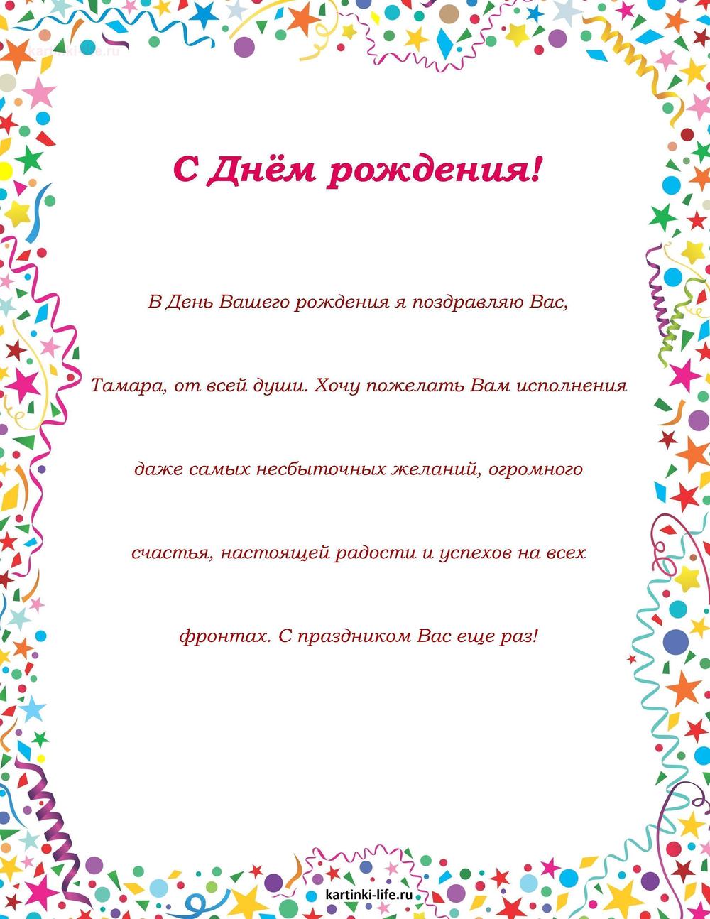 ← Предыдущая ГОЛОСОВЫЕСледующая → Выберите и нажмите! Другие варианты открыток с этим текстом Скачать Скачать Скачать Скачать Скачать Скачать Скачать Скачать Скачать Скачать Скачать Скачать Скачать Скачать Скачать СкачатьТамара. Открытки С Днем рождения по именам. Поздравления. РЕКОМЕНДОВАНО К ПРОСМОТРУ Смешная картинка с днем рождения ТамараОТКРЫТЬСКАЧАТЬ Красивая открытка с днем рождения для женщины ТамарыОТКРЫТЬСКАЧАТЬ Картинка с поздравлением с днем рождения женщине ТамареОТКРЫТЬСКАЧАТЬ Картинка с цветком в вазе и ноутбуком на День рождения ТамареОТКРЫТЬСКАЧАТЬ Открытка с поздравлением Тамаре с днем рожденияОТКРЫТЬСКАЧАТЬ Пожелание, роза и подарки дорогой ТамареОТКРЫТЬСКАЧАТЬ С днем рождения, Тамара. Песня для Тамары. [Тамара, с днем рождения. Видеооткрытка]ОТКРЫТЬСКАЧАТЬ Именные открытки с Днем рождения Тамара. поздравление на телефон с Днем рождения скачать.ОТКРЫТЬСКАЧАТЬ Именные открытки с Днем рождения Тамара. С приколом с Днем рождения скачать на смартфон.ОТКРЫТЬСКАЧАТЬ Открытка на День рождения Тамаре - поздравление в рамке из красных лепестковОТКРЫТЬСКАЧАТЬ Открытки С Днем рождения по именам Открытки С Днем рождения по категориям Продолжить просмотр Поздравление с Днем рождения Тамаре в прозе. В День Вашего рождения я поздравляю Вас, Тамара, от всей души. Хочу пожелать