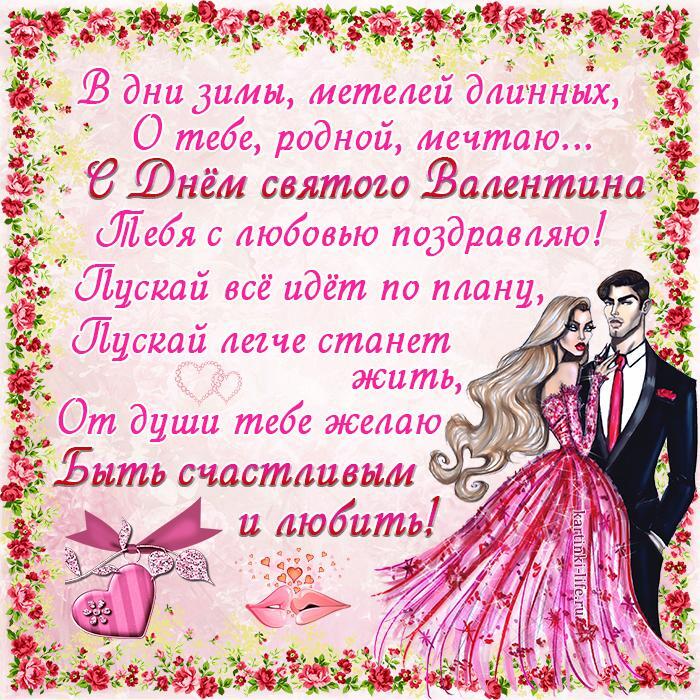 Поздравление с Днем святого Валентина для любимого: В дни зимы, метелей длинных, О тебе, родной, мечтаю... С Днем святого Валентина Тебя с любовью поздравляю! Пускай все идет по плану, Пускай легче станет жить, От души тебе желаю Быть счастливым и любить!