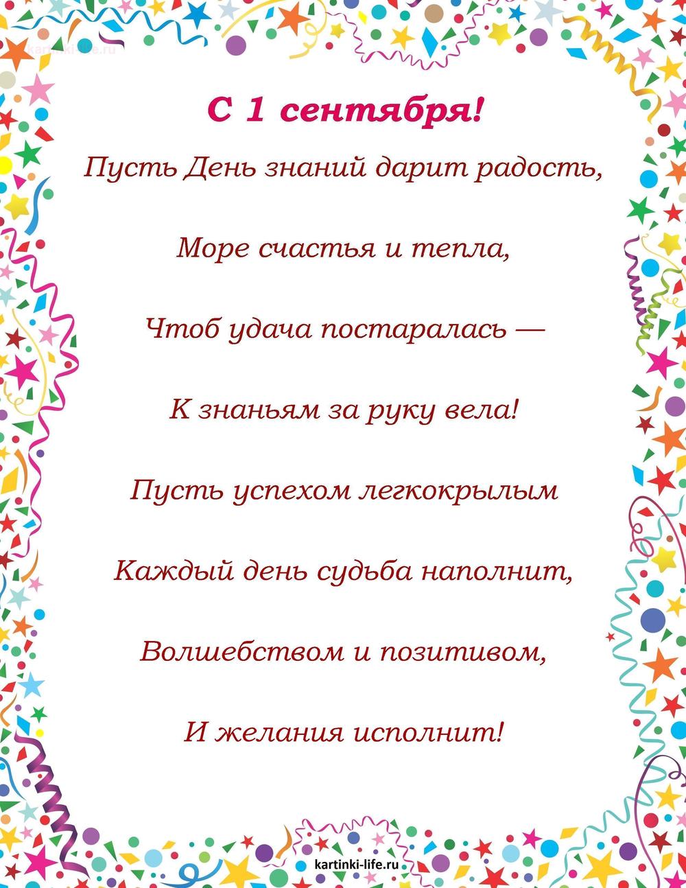 ← Предыдущая ГОЛОСОВЫЕСледующая → С 1 Сентября. Красивые открытки и картинки пока 0оставить комментарий РЕКОМЕНДОВАНО К ПРОСМОТРУ Открытка С началом учебного года!ОТКРЫТЬСКАЧАТЬ Открытка, картинка, сентября, начало учебного года, день знаний, школа, поздравление, доска. Открытки Открытка, картинка, сентября, начало учебного года, день знаний, школа, поздравление, школьная доска.ОТКРЫТЬСКАЧАТЬ Яркая открытка с колокольчиком на 1 сентябряОТКРЫТЬСКАЧАТЬ Анимированная открытка День знанийОТКРЫТЬСКАЧАТЬ Открытка с кленовыми листьями на День знанийОТКРЫТЬСКАЧАТЬ Открытка, картинка, 1 сентября, начало учебного года, день знаний, поздравление, первый звонок, листва. Открытки Открытка, картинка, 1 сентября, начало учебного года, день знаний, поздравление, первый звонок, листва, сентябрь.ОТКРЫТЬСКАЧАТЬ 1 сентября. С началом нового учебного года! Девочка в розовом платье с книгой на фоне учебной доски.ОТКРЫТЬСКАЧАТЬ Анимированная открытка Знание-сила! игрыОТКРЫТЬСКАЧАТЬ 1 сентября. Пожелание учительнице на День знаний. Желаю Вам всегда такой же оставаться, построже - иногда. И чаще улыбаться. Учительницей стать недаром Вы решили, желаем процветать, чтоб дети Вас любили!ОТКРЫТЬСКАЧАТЬ Открытка, картинка, сентября, начало учебного года, день знаний, школа, поздравление, цветы. Открытки Открытка, картинка, сентября, начало учебного года, день знаний, школа, поздравление, цветы, колокольчики.ОТКРЫТЬСКАЧАТЬ 299 открытокС 1 СЕНТЯБРЯ С ДНЕМ ЗНАНИЙ ПОЖЕЛАНИЯ Открытки с Днем рождения Продолжить просмотр Поздравление на первое сентября, на день знаний. Пусть День знаний дарит радость, Море счастья и тепла,