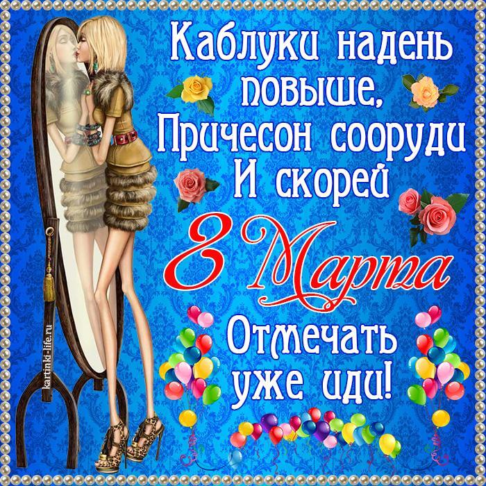 Прикольная открытка с 8 Марта: Каблуки надень повыше, Причесон сооруди И скорей 8 Марта Отмечать уже иди!
