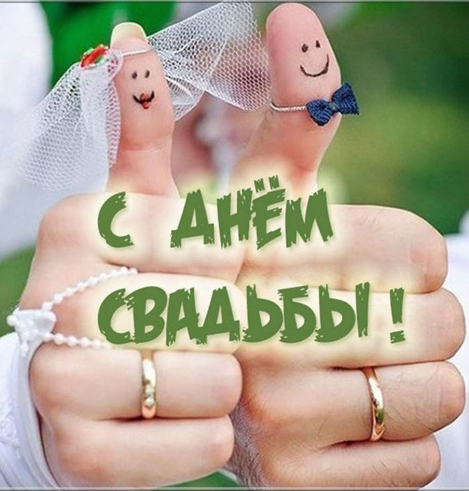 Прикольная открытка с днем свадьбы. Руки жениха и невесты с поднятыми большими пальцами.