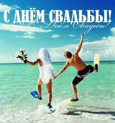 Прикольная открытка с днем свадьбы. Жених и невеста веселятся в ластах на берегу моря.