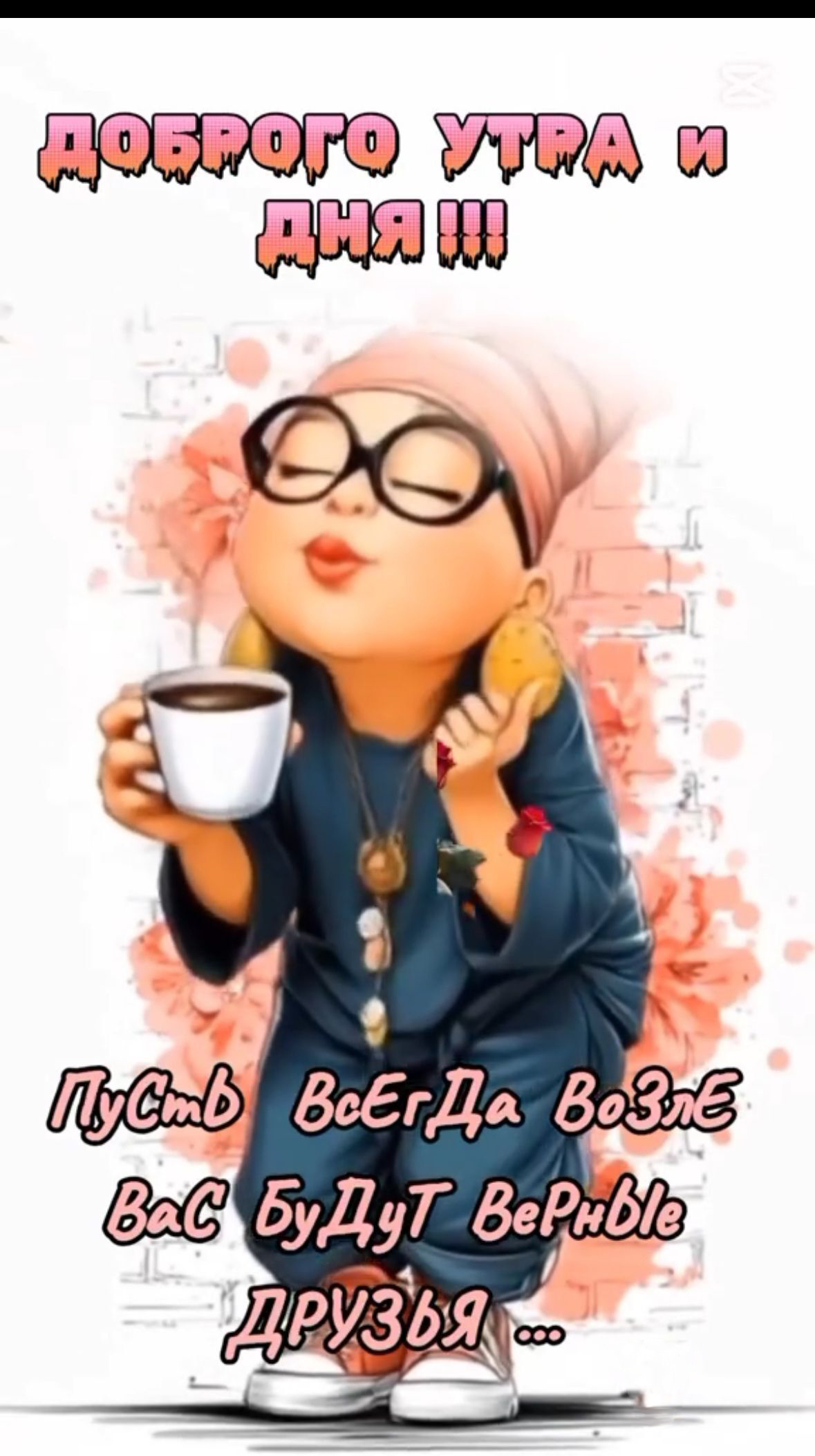 Прикольная открытка с добрым утром с пожеланием. Доброго утра и дня! Пусть всегда возле Вас будут верные друзья. Девочка с чашкой кофе.