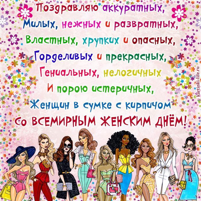 Прикольное поздравление с 8 Марта: Поздравляю аккуратных, Милых, нежных и развратных, Властных, хрупких и опасных, Горделивых и прекрасных, Гениальных, нелогичных И порою истеричных, Женщин в сумке с кирпичом Со ВСЕМИРНЫМ ЖЕНСКИМ ДНЕМ!