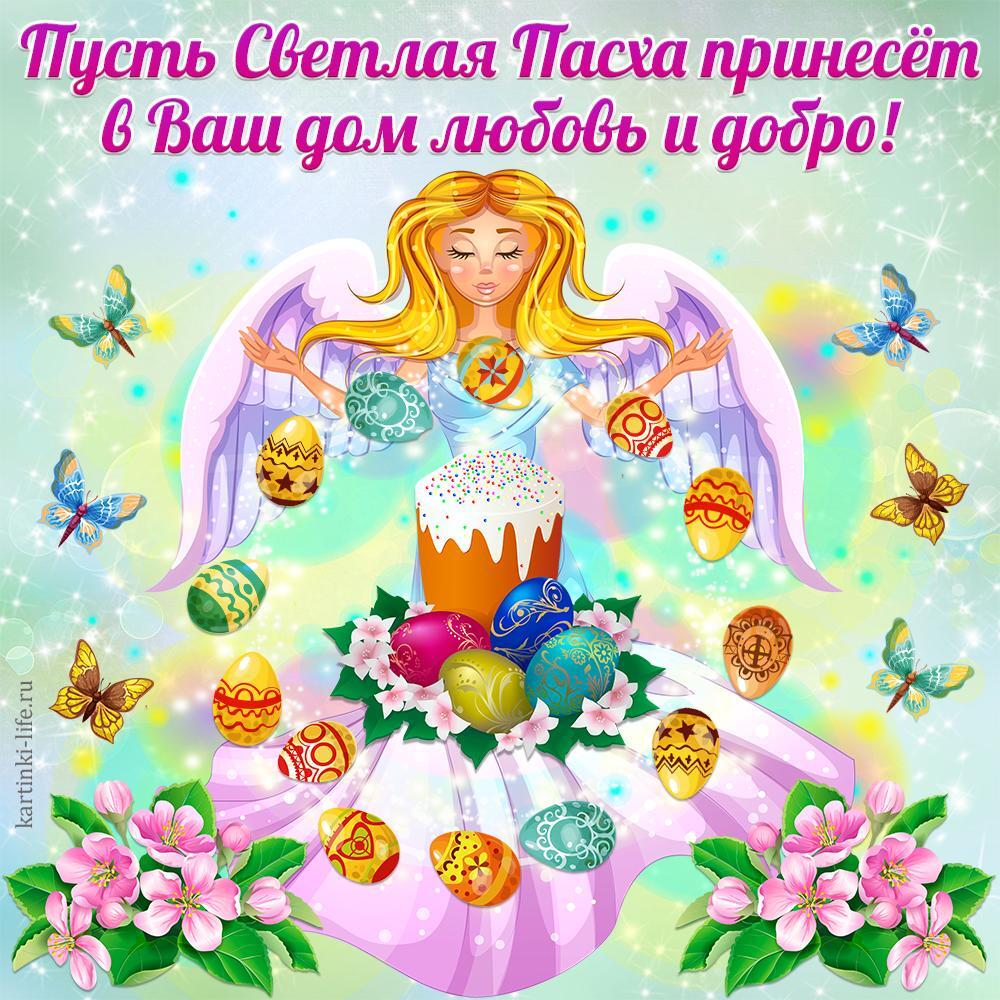Пусть Светлая Пасха принесет в Ваш дом любовь и добро! Красивая открытка с Пасхой, поздравление с Пасхой; парящий ангел с раскинутыми в стороны руками, перед ним круг из разноцветных яиц, в центре которого пасхальный кулич.