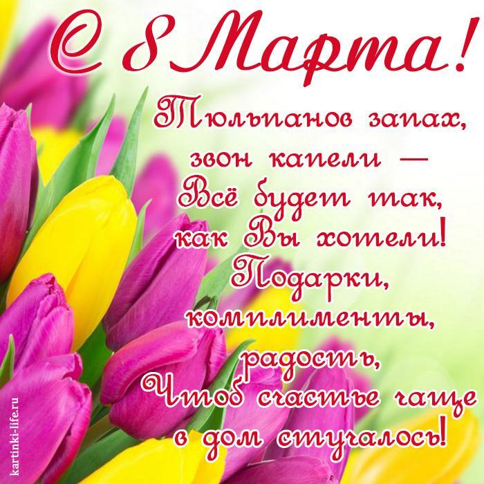 С 8 Марта! Тюльпанов запах, звон капели — Все будет так, как Вы хотели! Подарки, комплименты, радость, Чтоб счастье чаще в дом стучалось!