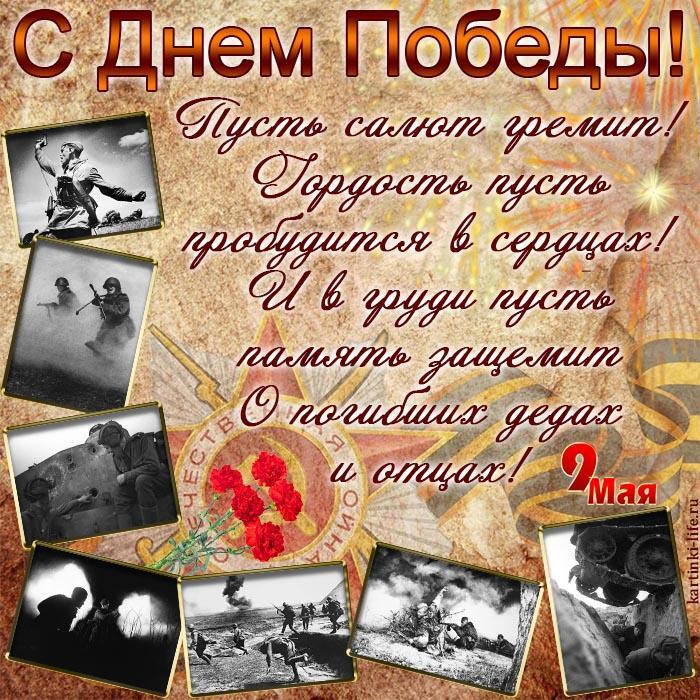 С Днем Победы! Пусть салют гремит! Гордость пусть пробудится в сердцах! И в груди пусть память защемит О погибших дедах и отцах!