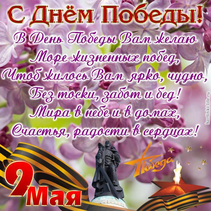 С Днем Победы! В День Победы Вам желаю Море жизненных побед, Чтоб жилось Вам ярко, чудно, Без тоски, забот и бед! Мира в небе и в домах, Счастья, радости в сердцах!