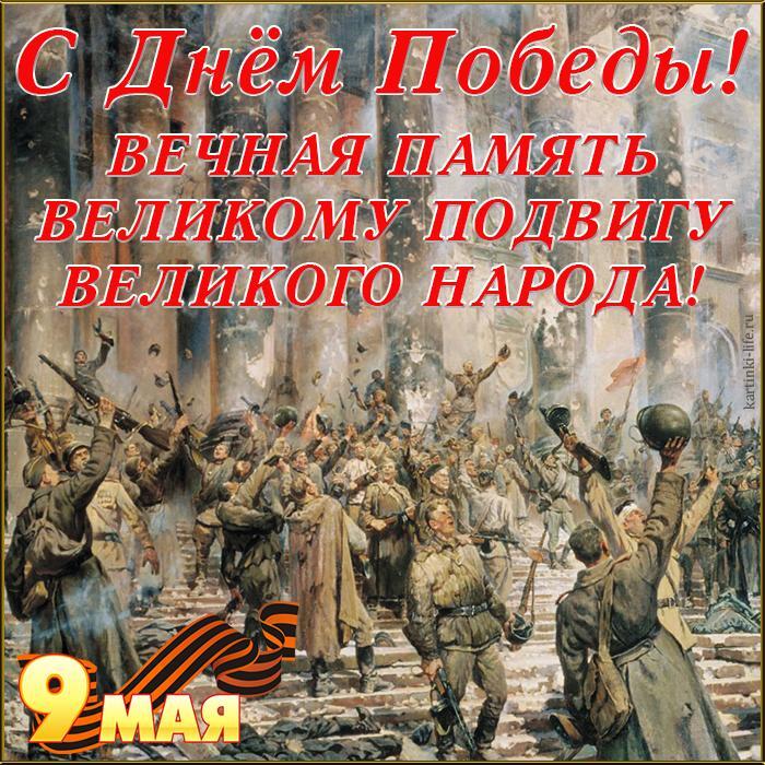 С Днем Победы! ВЕЧНАЯ ПАМЯТЬ ВЕЛИКОМУ ПОДВИГУ ВЕЛИКОГО НАРОДА! Красивая, патриотичная открытка с Днем Победы, Советские воины радуются Победе возле поверженного Рейхстага.