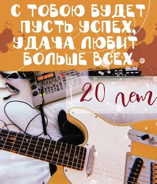 С днем рождения 20 лет юбилей. Парень с гитарой и пожелание.