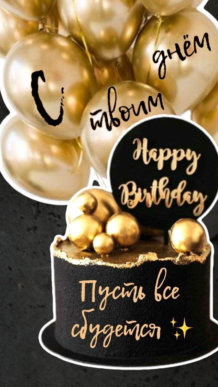 С днем рождения. Черные и золотые тона. Торт и шарики.