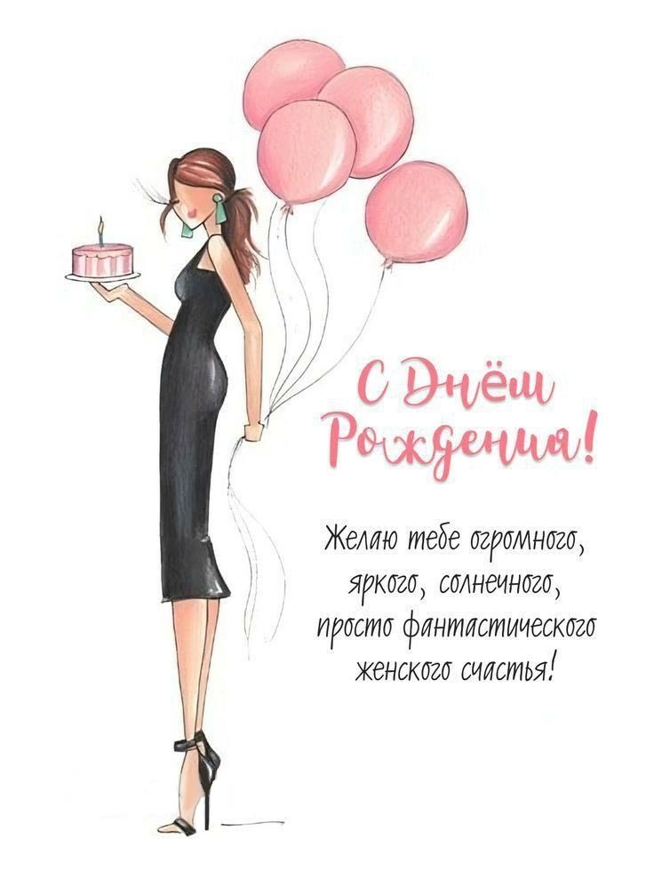 С днем рождения девушке. Девушка в платье, шарики, тортик, рисунок, пожелания.