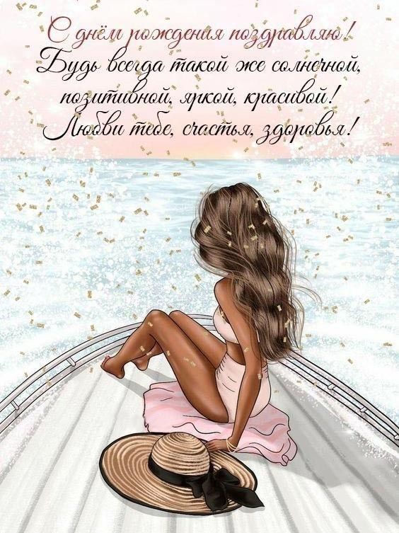 С днем рождения девушке. Пожелание, девушка у моря с шляпкой.