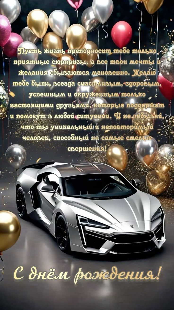 С днем рождения мужчине. Автомобиль, шарики и пожелания.