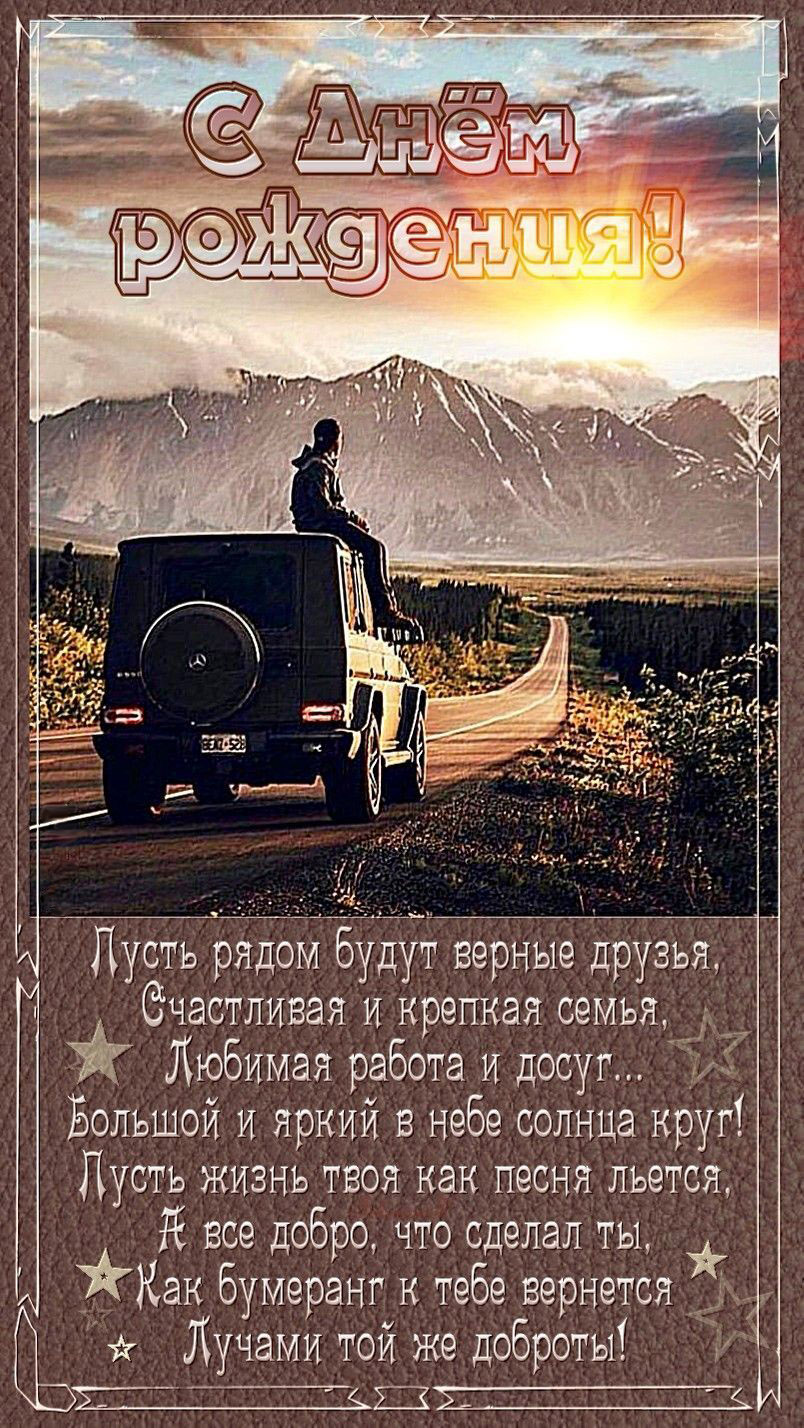 С днем рождения мужчине. Пожелание, автомобиль на дороге в горах.