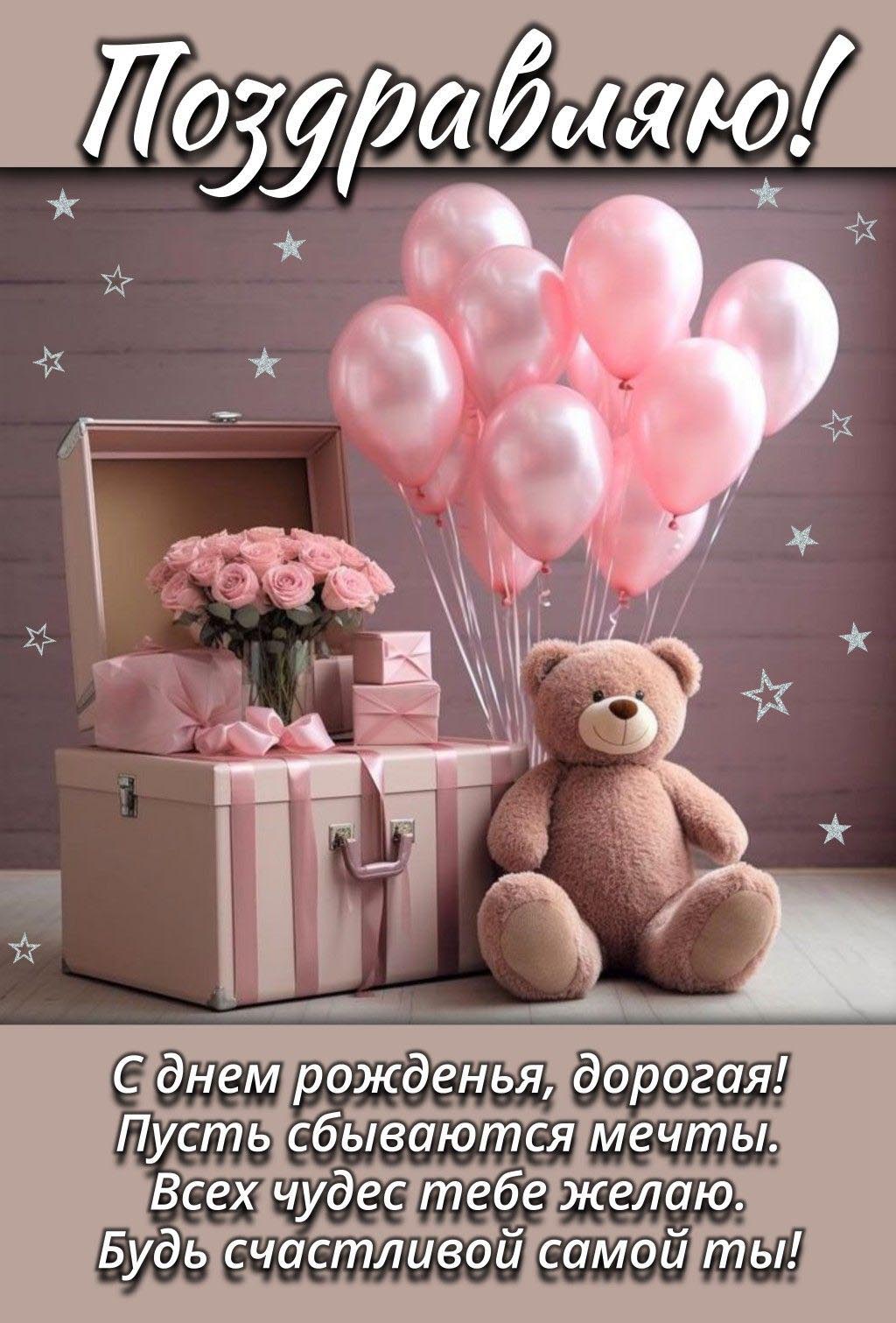 С днем рождения подруге. Мишка с шариками и пожелание.