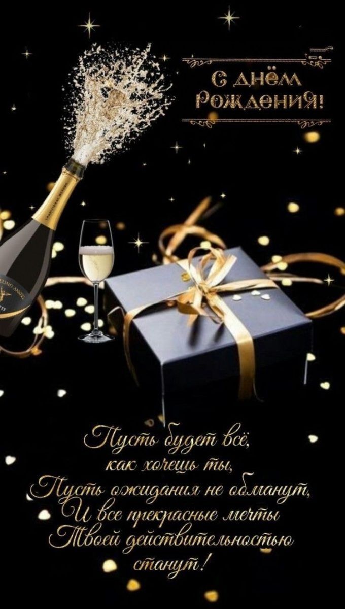 С днем рождения. Пожелания, шампанское, подарок.