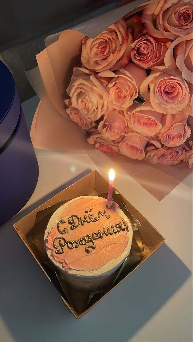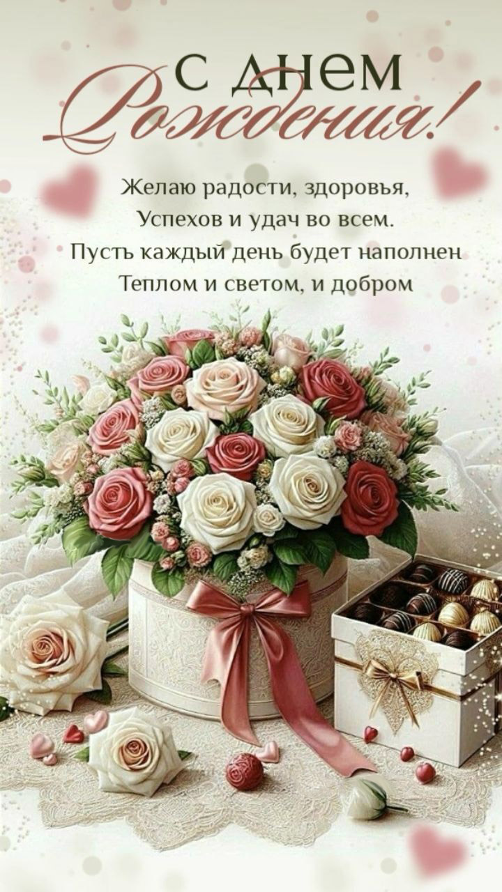 С днем рождения женщине. Букет роз, конфеты, пожелания.