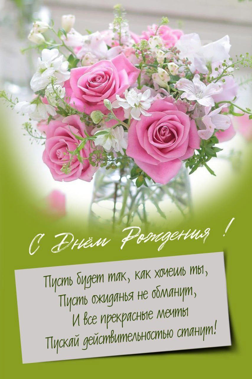 С днем рождения женщине на салатовом фоне. Цветы и пожелания.