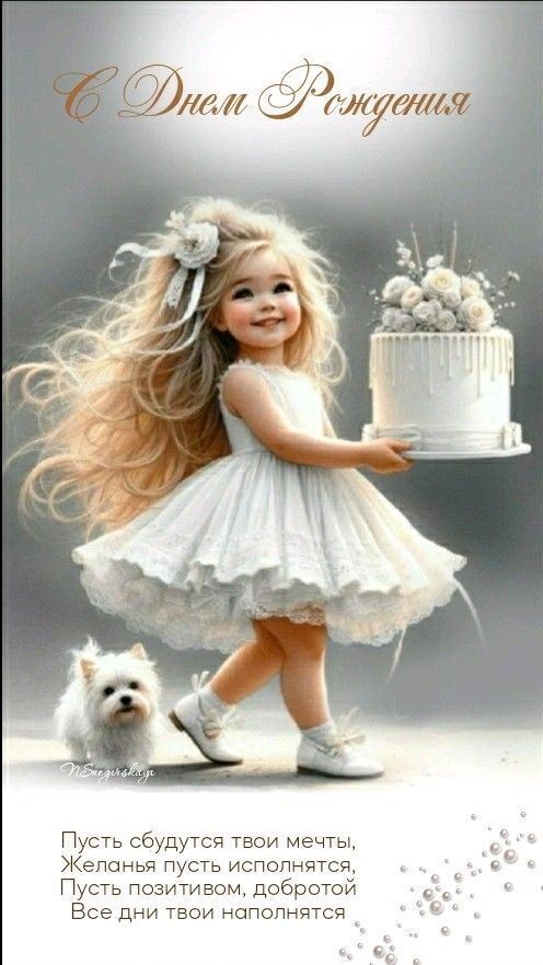С днем рождения женщине с пожеланиями. Девочка в белом платье с белым тортом и белой собачкой. Пусть сбудутся твои мечты, желания пусть исполнятся, пусть позитивом, добротой все дни твои наполнятся.