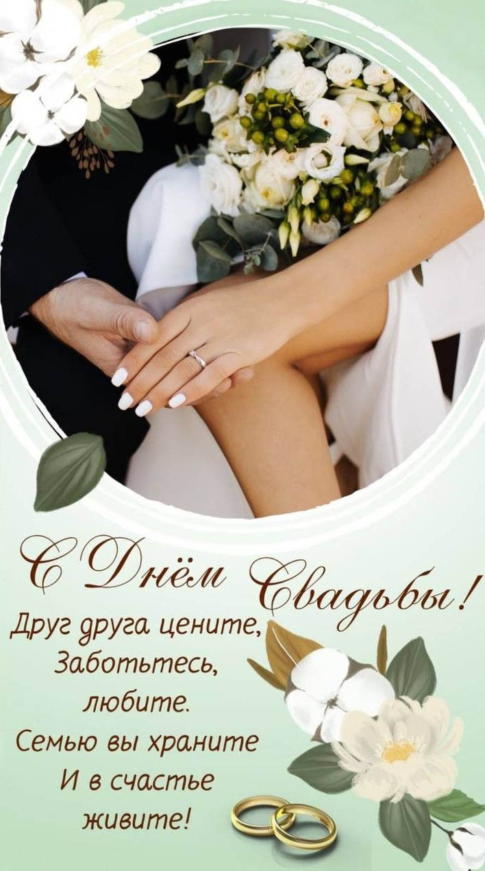 С Днем свадьбы. Пожелание, салатовый фон. Кольца и цветы, руки жениха и невесты.