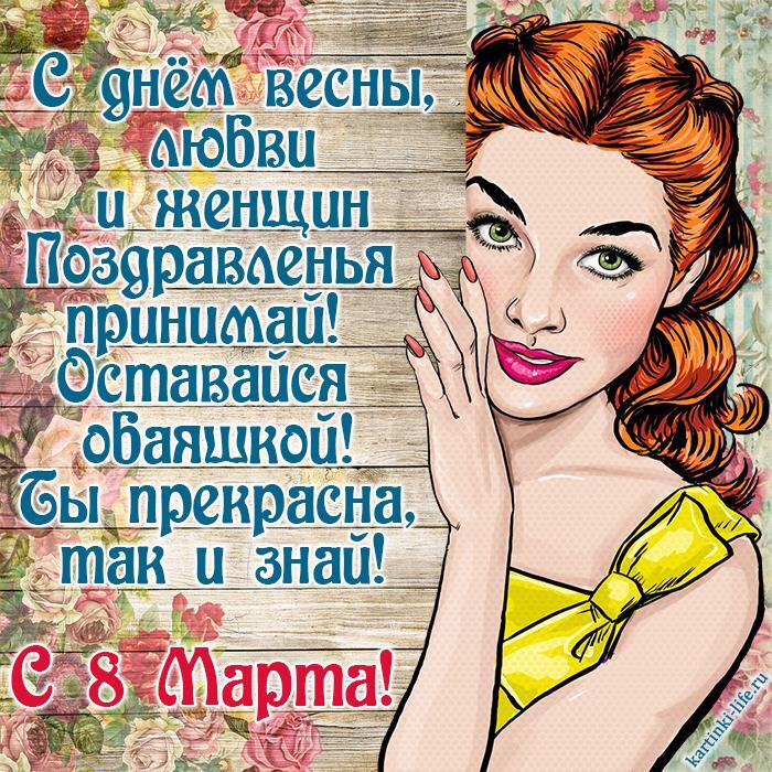 С днем весны, любви и женщин Поздравленья принимай! Оставайся обаяшкой! Ты прекрасна, так и знай! С 8 Марта!