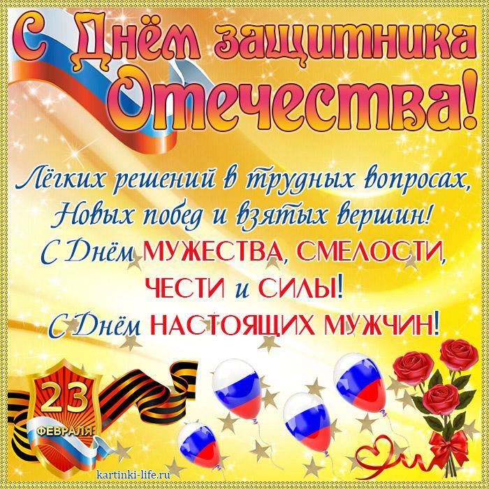 С Днем защитника Отечества! Легких решений в трудных вопросах, Новых побед и взятых вершин! С Днем мужества, смелости, чести и силы! С Днем настоящих мужчин!