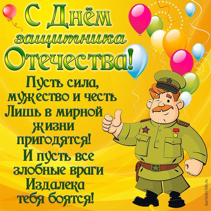 С Днем защитника Отечества! Пусть сила, мужество и честь Лишь в мирной жизни пригодятся! И пусть все злобные враги Издалека тебя боятся! Прикольная открытка с 23 Февраля; военный на фоне шариков.