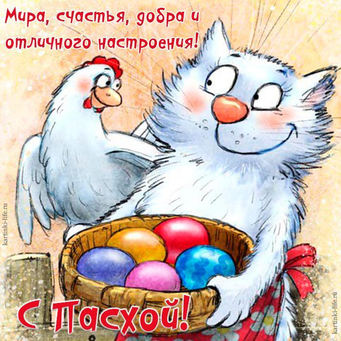 С Пасхой! Мира, счастья, добра и отличного настроения! Прикольная открытка с Пасхой, поздравление с Пасхой, хозяйственный белый кот в переднике держит в лапах корзинку с крашеными яйцами.