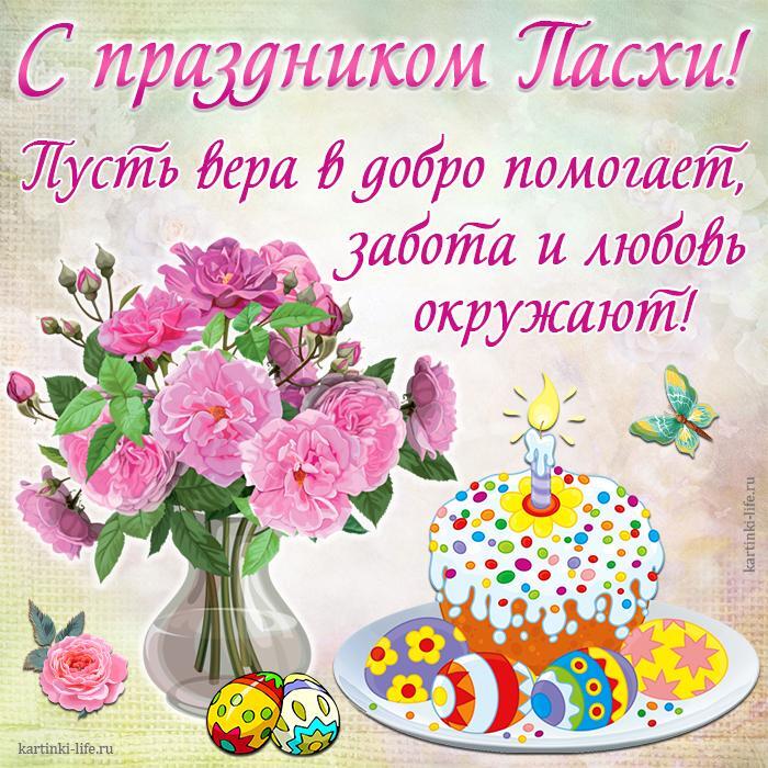 С праздником Пасхи! Пусть вера в добро помогает, забота и любовь окружают! Красивая открытка с Пасхой, пасхальный кулич и крашеные яйца, букет цветов, бабочка.