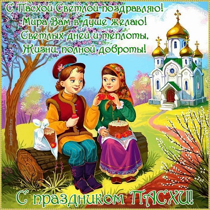 С праздником Пасхи! С Пасхой Светлой поздравляю! Мира Вам в душе желаю! Светлых дней и теплоты, Жизни, полной доброты! Красивая открытка с Пасхой, поздравление с Пасхой, дети сидят под деревом на бревне и играют в пасхальную игру, рядом с ними проходит дорожка, ведущая к церкви.