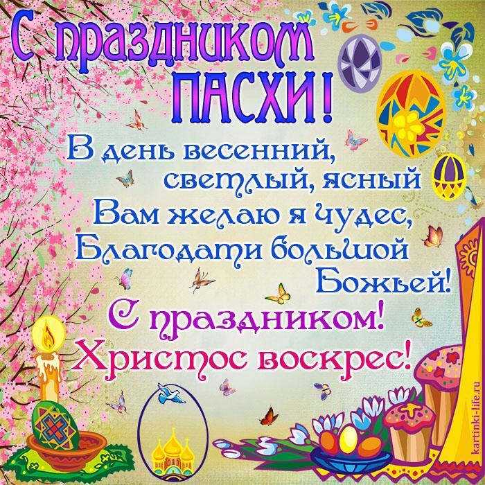С праздником Пасхи! В день весенний, светлый, ясный Вам желаю я чудес, Благодати большой Божьей! С праздником! Христос воскрес!