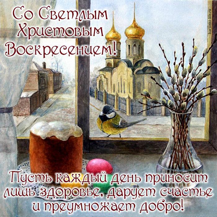Со Светлым Христовым Воскресением! Пусть каждый день приносит лишь здоровье, дарует счастье и преумножает добро! Красивая открытка с Пасхой, на подоконнике стоит пасхальный кулич, и лежат разноцветные крашеные яйца, в вазочке стоят веточки вербы, в окно заглядывает синичка, из окна открывается вид на церковь.