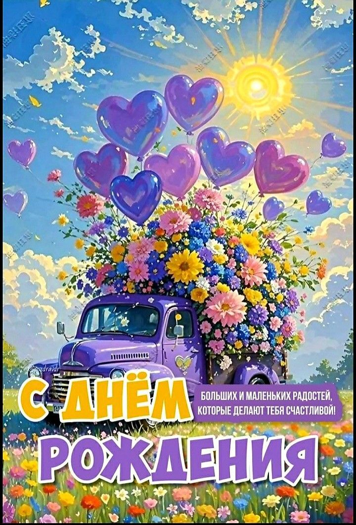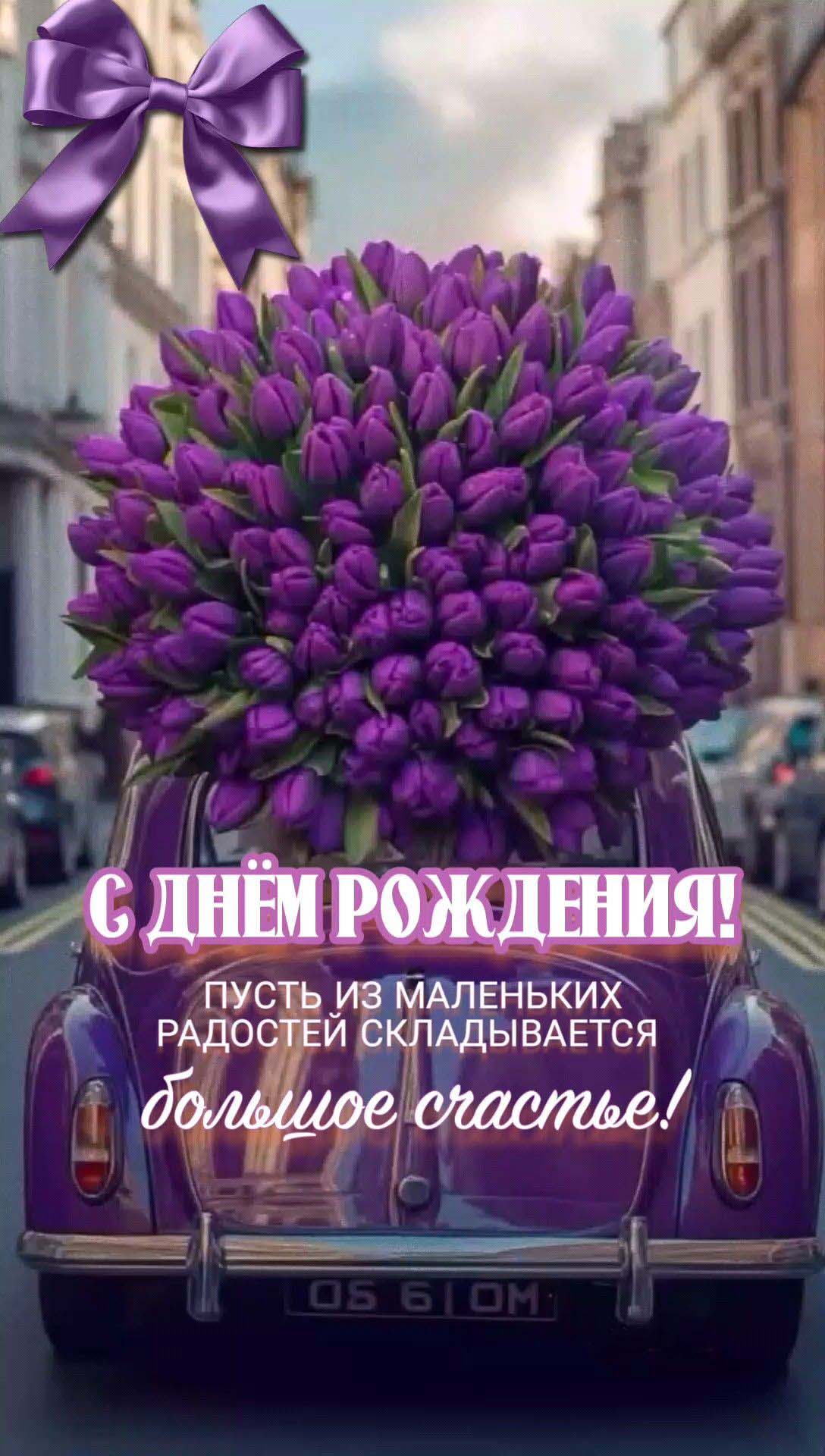 Современная открытка с днем рождения женщине с пожеланиями. Больших и маленьких радостей, которые делают тебя счастливой! Фиолетовый грузовичок с цветами и шариками-сердечками.