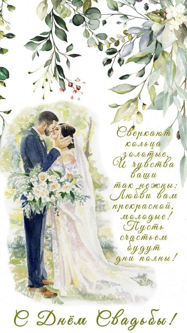Стильная открытка с днем свадьбы. Пожелания, нарядные жених и невеста.