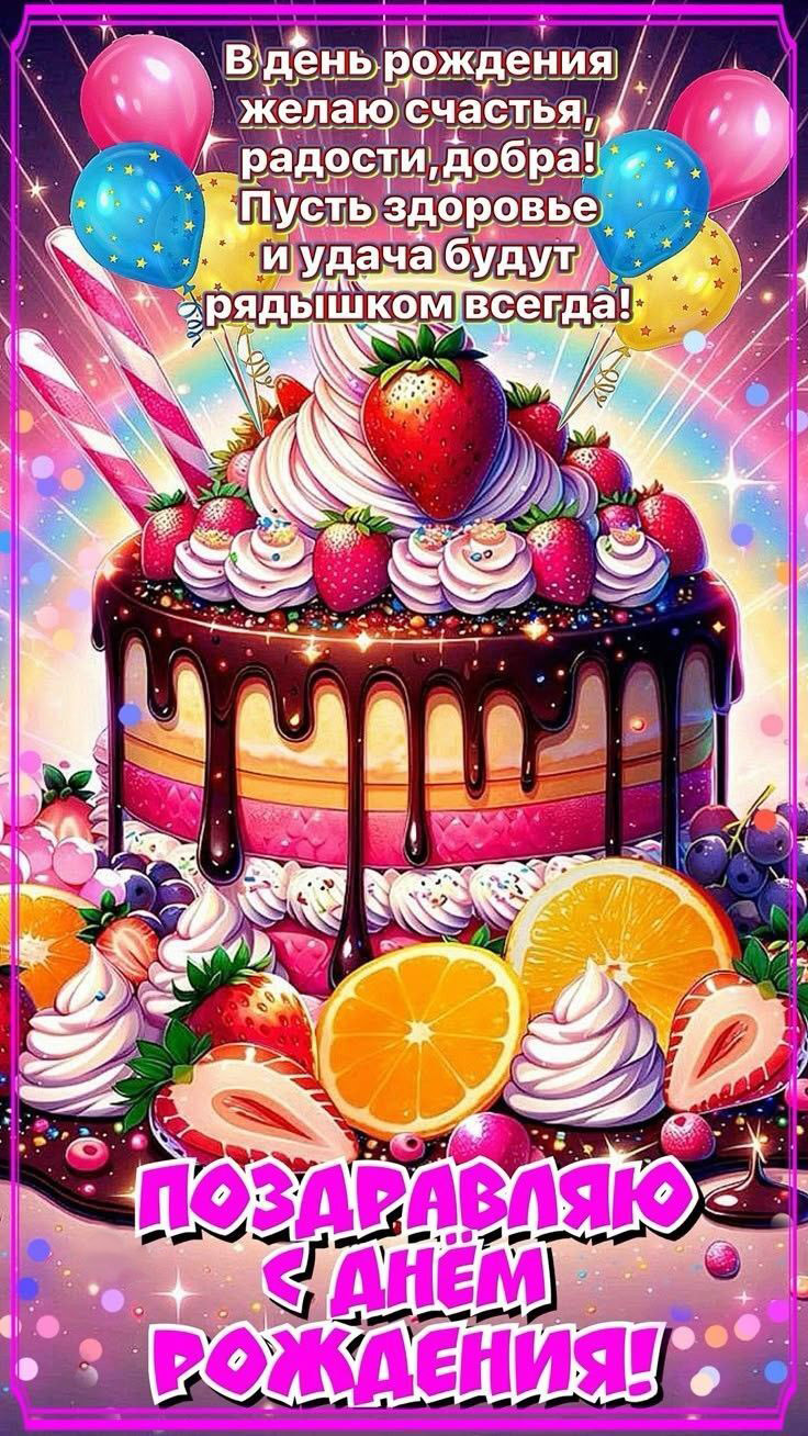 Яркая открытка с днем рождения. Много шариков и пожелание.